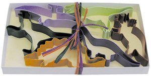 This colorful polyresin Dinosaur Cookie Cutter Set features a tricerotops, tyrannosaurus rex, brontsaurus, stegosaurus, velociraptor, and pterodactyl. All six are neatly packed in a 6-1/2 x 11 inch gift box tied with raffia ribbon. These make a great afternoon activity for little kids or a treat for budding paleontologists. Hand washing recommended.