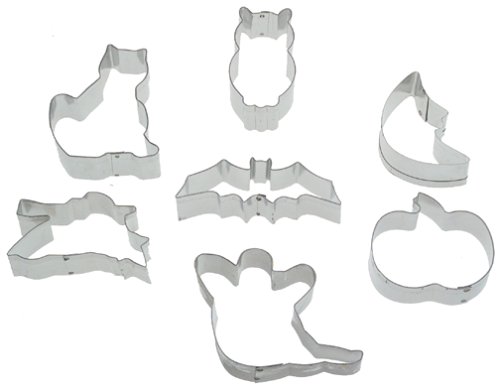 This tinplated steel Halloween cookie cutter set contains 7 pieces: Owl, Bat, Cat, Moon, Pumpkin, Ghost, and a Witch on a Broom. Comes in storage box. All pieces are approximately 3" long.