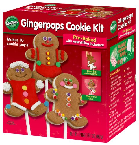 Build and decorate 10 jolly gingerpops to share with friends. Included in your kit are 20 pre-baked gingersnaps cookies (2 1/4 x 2 inch), creamy white icing mix, red liquid icing color packet, 3 types of colorful candy, 10 sticks, 10 treat bags, 10 self-sealing gift stickers, 2 decorating bags and tips, complete assembly and decorating instructions.