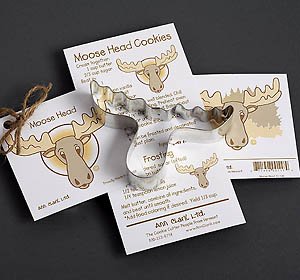 Tin cookie cutter in the shape of a Moose Head with sturdy tin handle and colorful recipe card. Each card includes a recipe for cookies and frosting. Size 5"W
